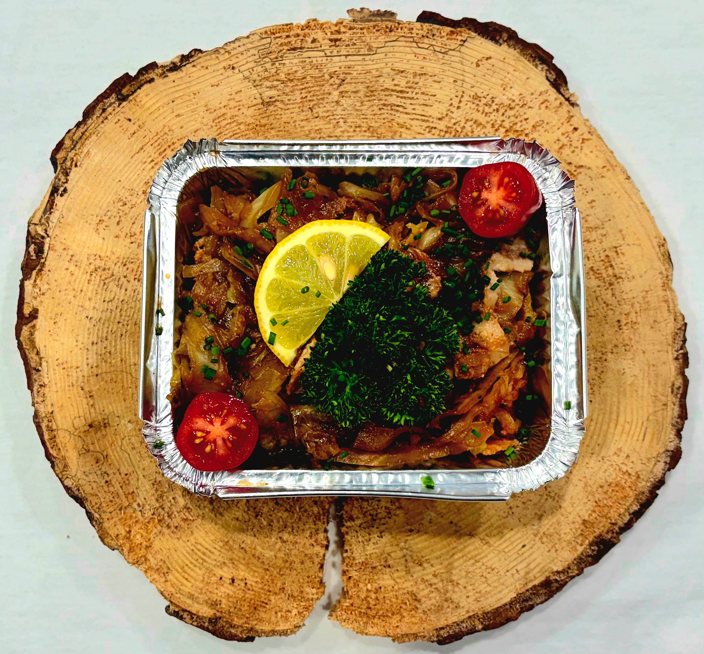 Ingrédients: Chou vert, bacon, vin blanc, baies de genièvre, oignons, ail et beurre