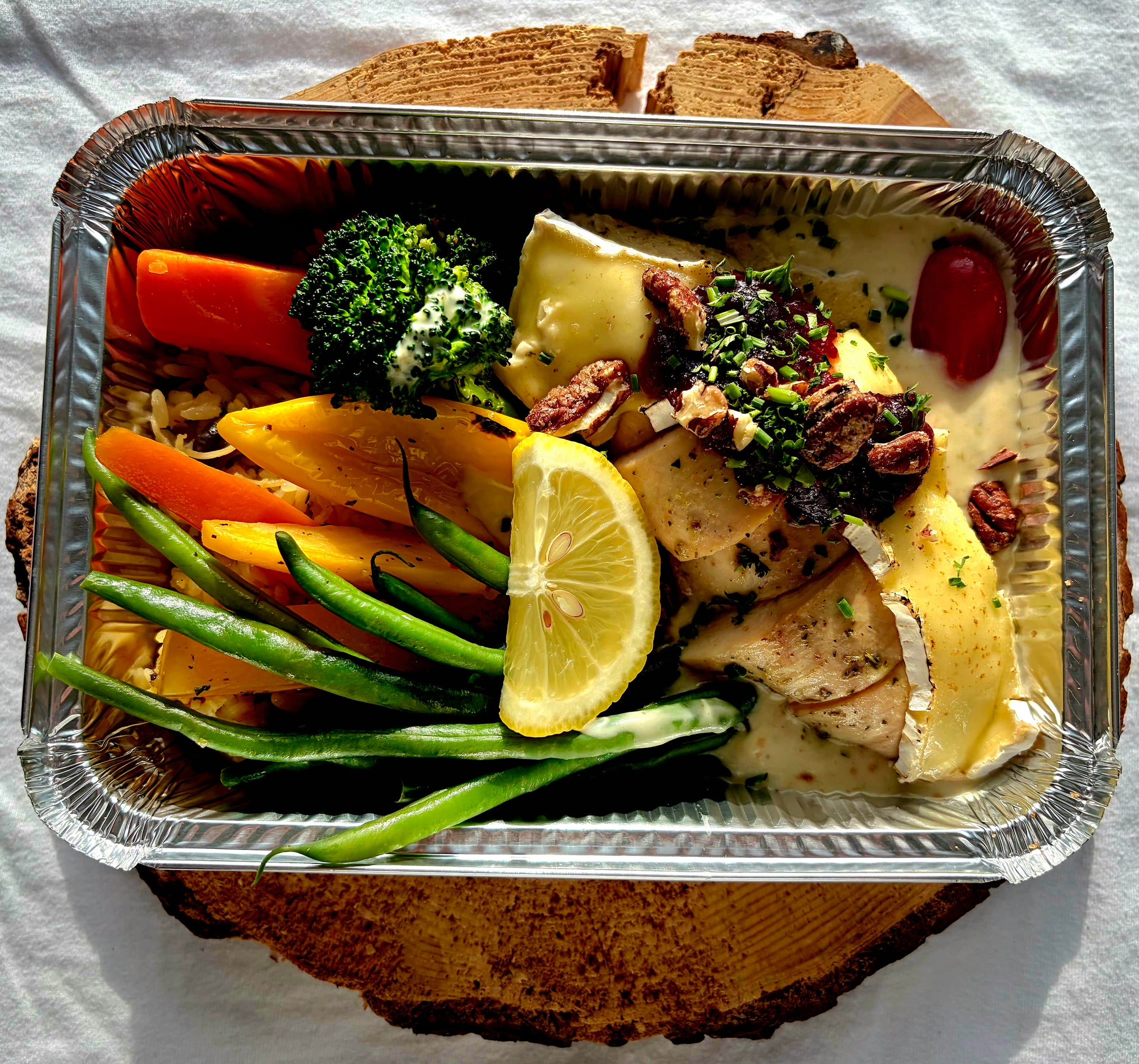 Poitrine de poulet rôtie, gratinée au brie, compote de canneberges, émietté de pacanes rôties, sauce crémeuse