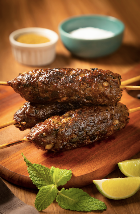 Moroccan-style grilled lamb keftas with olive oil, onions, garlic, parsley, cilantro, and harissa, served with lemon tahini sauce.