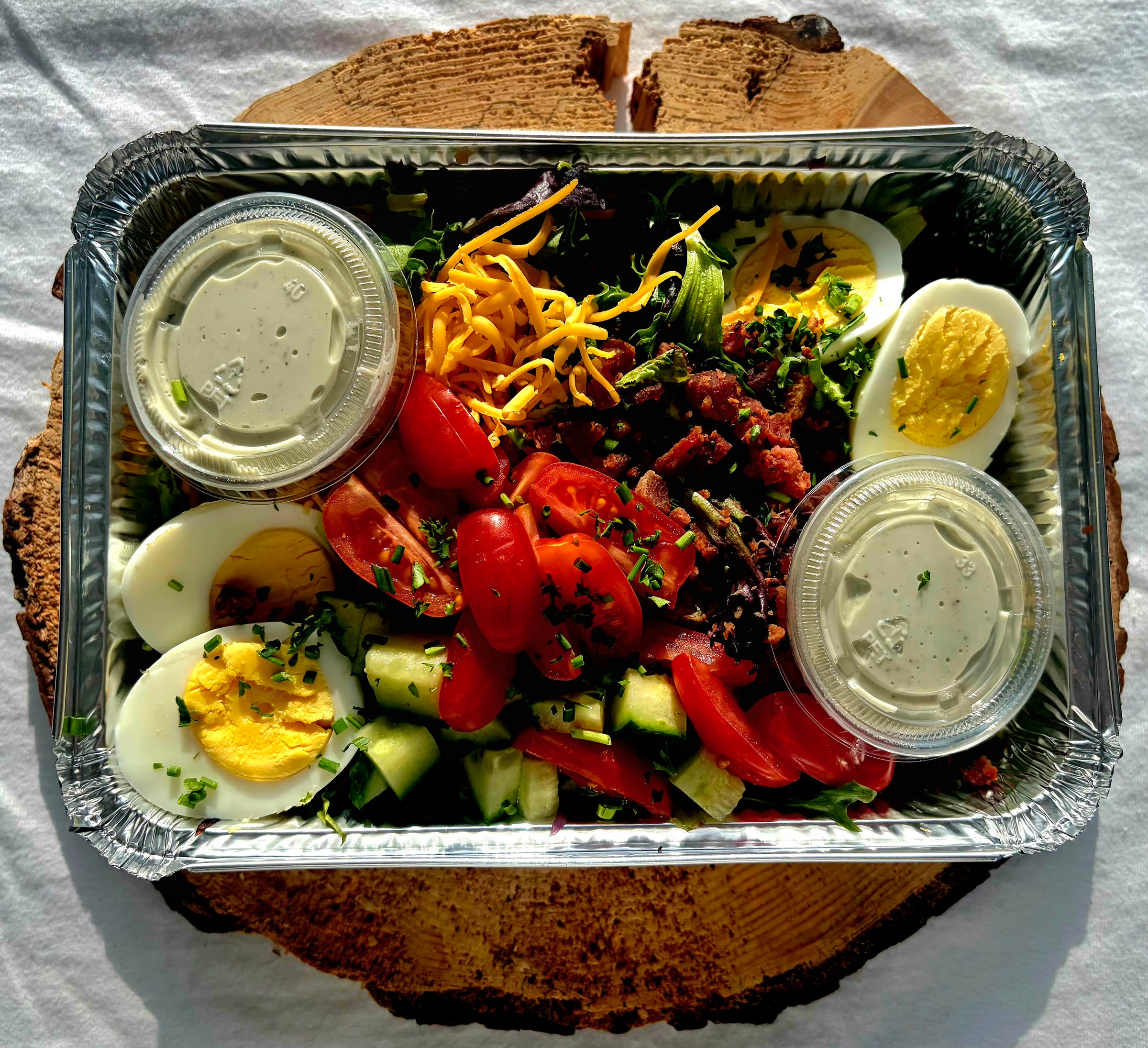 Ingredients: Mixed lettuce, crumbled bacon, hard-boiled egg, red onions, cucumber, cherry tomatoes, cheddar cheese, blue cheese, olive oil, white wine vinegar, Dijon mustard, and honey.