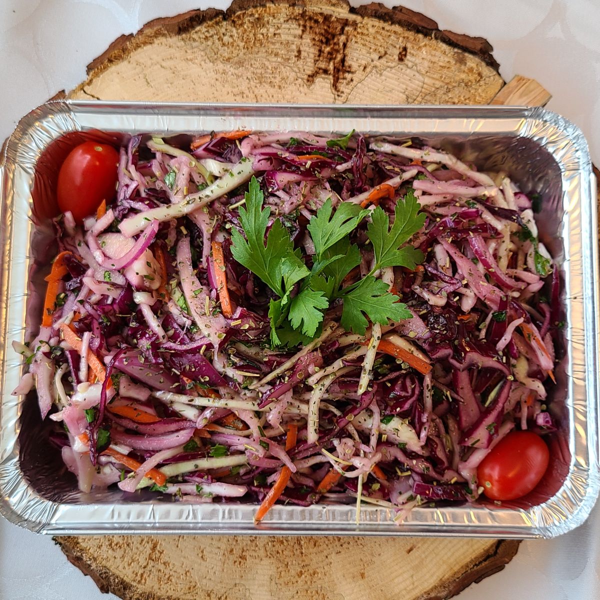Ingredients: Red cabbage, green cabbage, carrots, parsley, shallots, white balsamic vinegar, olive oil, mayonaise and fine herbs