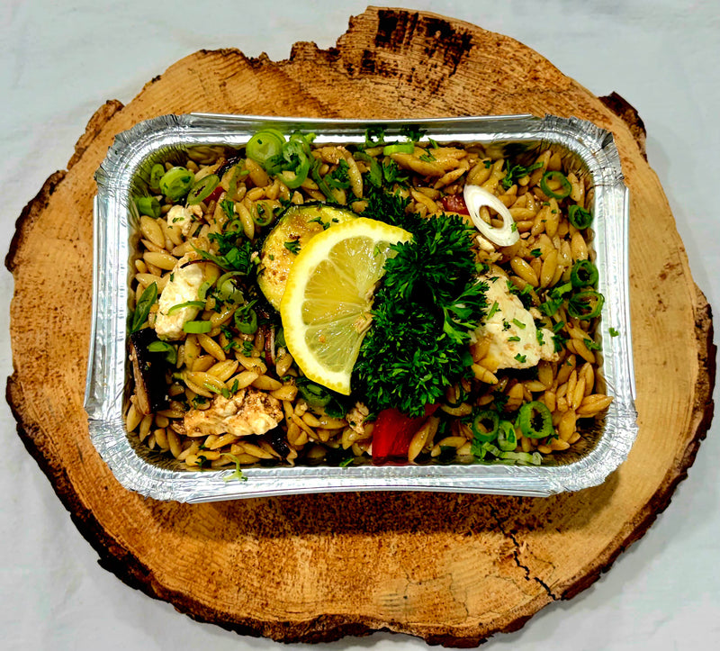 Orzo salad with roasted vegetables, feta cheese, and fresh basil