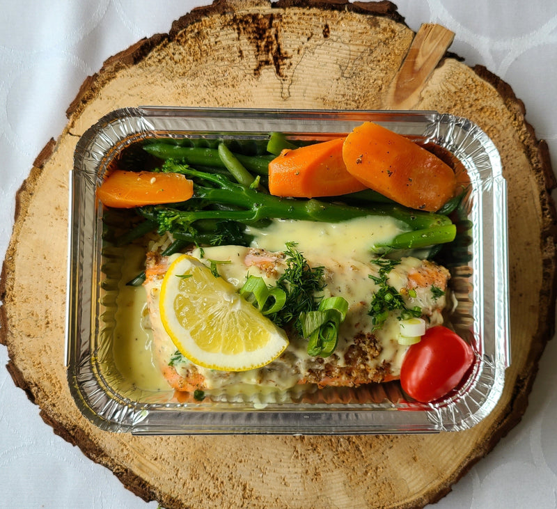 Roasted salmon fillet in a pistachio and herb crust with creamy white wine sauce