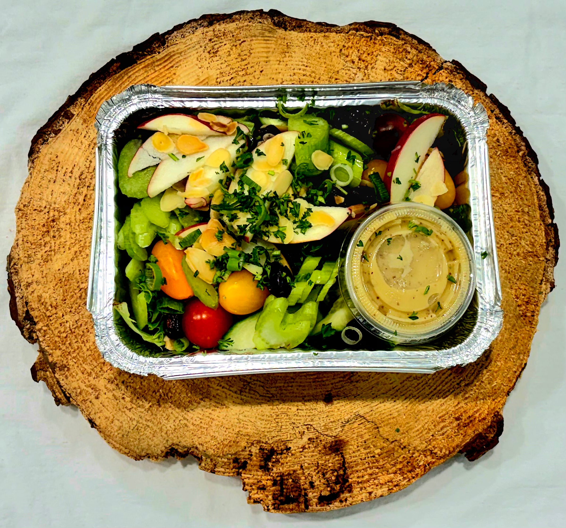 Ingredients: Mixed lettuce, apples, celery, cherry tomatoes, roasted almonds, dried cranberries, cucumbers, red onions, parsley, olive oil, red wine vinegar, dijon mustard and maple syrup