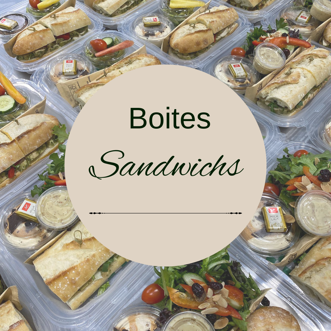 Chaque boîte inclus une salade, un sandwich, des crudités, un dessert et un chocolat. Nous offrons jusqu'à deux choix de salades et trois choix de sandwichs par groupe.